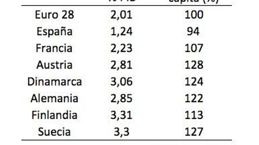 Tal y como concibo este concepto para el futuro de una economía, debemos examinar el caso de España. Con un 1.24 % del PIB de acuerdo a las últimas estadísticas, se sitúa en el puesto 17 (de 28) en el ranking de países europeos en inversión en I+D+i; muy lejos del más de 3% que invierten países nórdicos como Dinamarca, Suecia y Finlandia. Si además tomamos como indicador de crecimiento de una economía el PIB per cápita, podemos ver cómo estos países son los que tienen tasas de crecimiento por encima de la media europea a la vez que España no la alcanza. Por tanto, podemos encontrar una correlación positiva entre inversión en investigación y crecimiento.