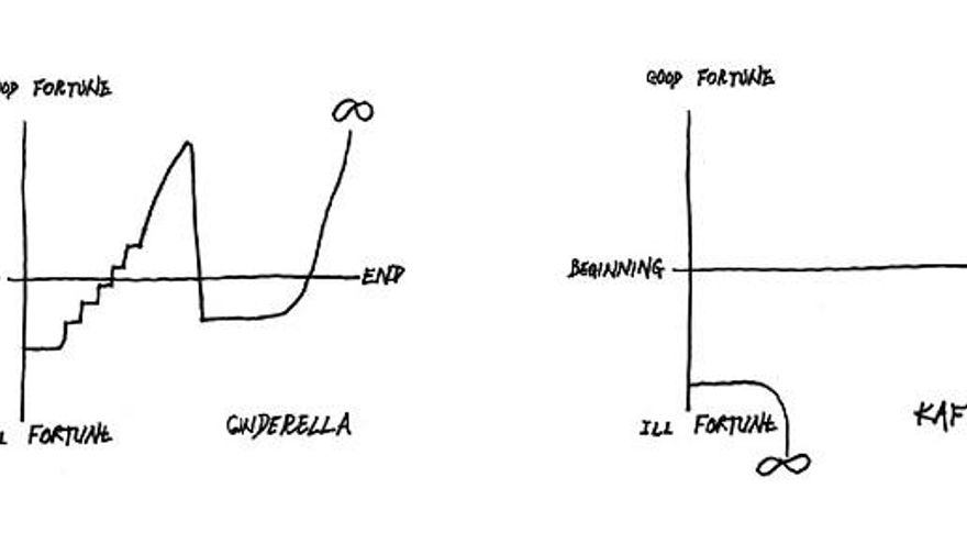 Entre otras posibilidades de historias, Vonnegut señalaba la que comienza desde la mala fortuna (por ejemplo Cenicienta) y se alza imparable (después de la mediación del hada madrina) hasta que una vez arriba cae en picado (las campanadas), para volver a subir en una apoteosis final hasta la felicidad infinita. El diagrama para la Metamorfosis de Kafka es menos optimista. Se inicia en la parte inferior, la de la desgracia, y sencillamente cae un poco más. Fin.