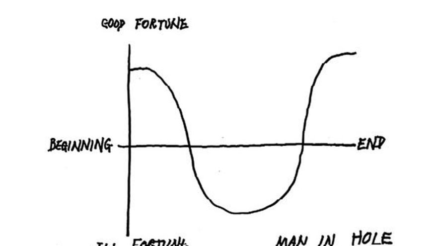 Con su habitual sentido del humor e inteligencia, el escritor estadounidense Kurt Vonnegut ideó un brillante sistema para dar cuenta de las distintas curvas emocionales que podían adoptar las historias. En su artículo 'Ahí va una lección de escritura creativa', recogido en el libro Un hombre sin patria, pueden verse sus conocidos diagramas. Éstos se conforman por un eje vertical que va de la buena suerte, en la parte superior, a la peor de las suertes, en la inferior, y un eje horizontal que indica el comienzo y el final en el tiempo. En la historia más simple, la del “hombre en el hoyo”, un protagonista situado en un punto intermedio de la buena suerte cae en desgracia y al final remonta. “Hemos salido de la indigencia”.