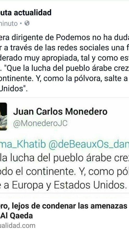 El 7 de enero el dirigente de Al Qaeda, Ayman Al Zawahiri, declaraba la yihad contra España y especialmente contra Ceuta y Melilla, al animar a sus milicias a luchar contra la “usurpación española” de ambos territorios. Pues bien, al día siguiente, el diario digital Ceutaactualidad.com difundía un tuit de Juan Carlos Monedero donde afirmaba: “la lucha del pueblo árabe crezca en todo el continente. Y, como pólvora, salte a Europa y Estados Unidos”.