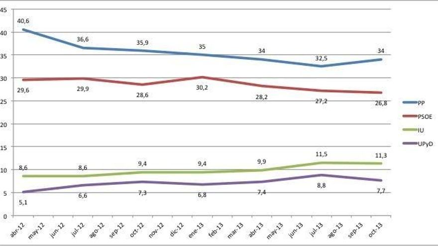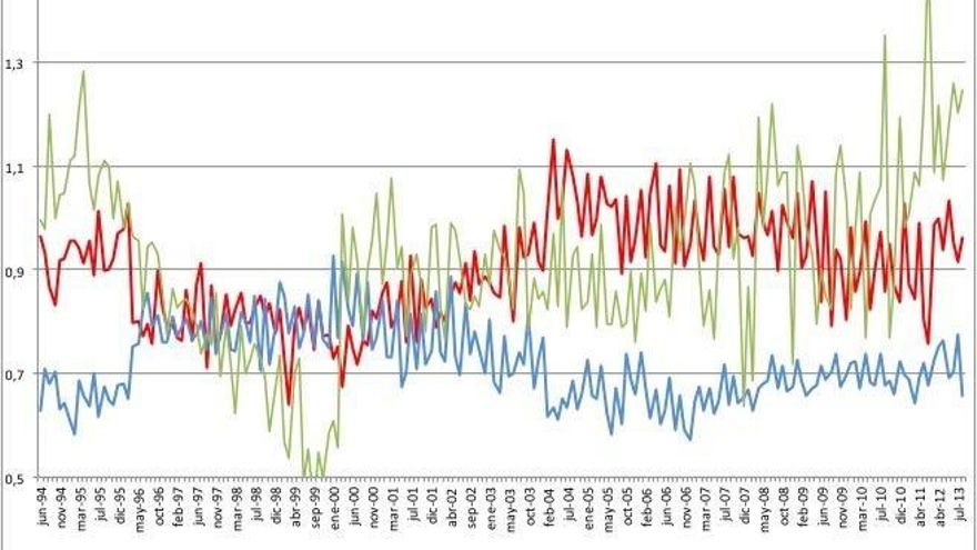 La ocultación de voto al PP es muy similar a la que venimos observando a esta formación política desde el año 2003. Es decir, desde hace 10 años, los votantes del Partido Popular están infraestimados en las encuestas. Esto choca en parte con una lógica que también se ve en este gráfico. Cuando gobierna el PP (1997-2002), su recuerdo de voto y la realidad se aproximan. Pero cuando está en la oposición es cuando aumenta el voto oculto al Partido Popular. Ahora, en cambio, pese a estar en el Gobierno, hay una infraestimación enorme de sus votantes. Aquí caben dos interpretaciones.