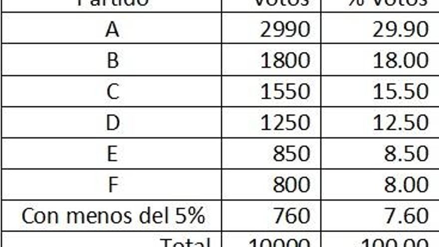 Ahora bien, ¿qué habría ocurrido si el partido E hubiese recibido cincuenta votos menos, porque esos votantes se hubiesen abstenido? En tal caso el partido A habría obtenido, en la primera vuelta, el 30.05% de los votos y el partido B el 18.09%%, con lo cual se habría asignado al partido A mayoría absoluta de concejales, es decir a 7 de los 13 concejales, y los otros 6 se los distribuirían entre los restantes partidos resultando 2-1-1-1-1