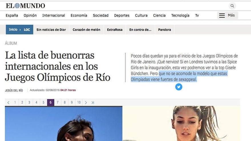 Además, en El Mundo, usaron el recurso de hacer un artículo idéntico pero con hombres llamado de “La lista de los buenorros internacionales en los JJ.OO. de Río”, por lo de la igualdad y tal. Y, aunque nadie se quejó del artículo ni del título sobre ellos, también le cambiaron el título a éste por el de “Lista de atletas olímpicamente atractivos”.