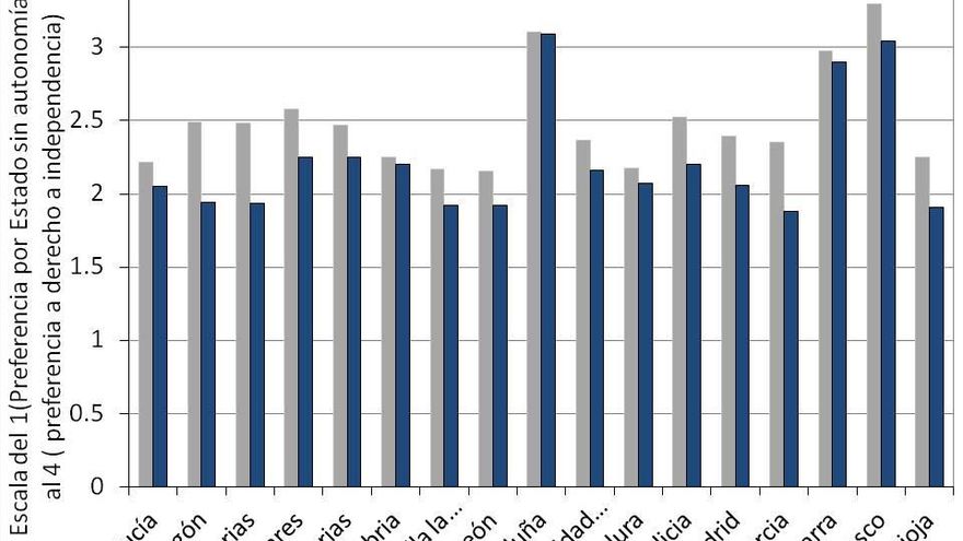 Uno de los cambios más importantes en la opinión pública durante los últimos años, y que se ha intensificado en el 2012, es el aumento significativo de las preferencias por un modelo territorial más centralizado. El debate autonómico ha polarizado a la izquierda internamente (aumentando las diferencias la extrema izquierda y la moderada) y, como se ve en el gráfico, también ha aumentado las diferencias entre territorios. Todo un reto para los partidos de izquierda nacionales que quieran elaborar un discurso territorial cohesionado con el que puedan sumar votos en todas las Comunidades Autónomas.