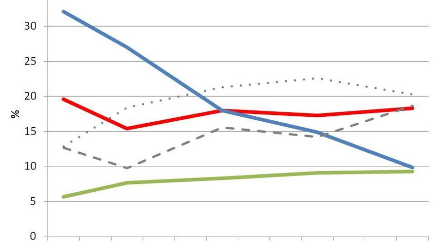 8. Hundimiento en la intención de voto al PP y auge de los no alineados