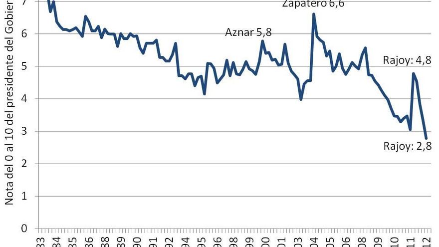 El 2012 también ha sido el año en que Mariano Rajoy dilapida prácticamente todo su crédito político. Su andadura como Presidente del Gobierno se iniciaba a finales del año pasado con valoraciones ligeramente inferiores al aprobado (4,8). A pesar de que pueda parecer una nota mediocre, ésta representaba un notable aumento en comparación a las pésimas valoraciones cosechadas por su predecesor en el cargo. Durante sus últimos años del mandato, Rodríguez Zapatero tuvo el dudoso honor de alcanzar cotas de impopularidad hasta entonces desconocidas (3,1 sobre 10). Sin embargo, el nuevo Presidente del Gobierno cierra su primer año con una nota de 2,8 sobre 10, batiendo un nuevo récord de impopularidad. ¿Estamos ante un suelo imposible de superar o seguiremos conociendo nuevos fondos? El 2013 nos dirá.