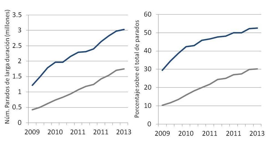 Sin duda 2012 fue un año dramático una vez más para el empleo en España. Uno de los problemas que recibe demasiado poca atención es la cronificación del desempleo que supone que una parte cada vez mayor de la fuerza de trabajo pase largos periodos de tiempo sin trabajar. Los trabajadores que pasan largos perdidos desempleados son mucho más difíciles de reincorporar al empleo, por lo que las altas tasas “coyunturales” de desempleo actuales probablemente anuncien altas tasas “estructurales” de desempleo en el futuro. 2012 fue un año en el que España ha batido unos récords particularmente preocupantes a este respecto. La EPA del tercer trimestre certificó que hay más de 3 millones de parados de larga duración, más de un 13% de la población activa. Y como muestra la parte derecha del gráfico, este colectivo ha sido por primera vez en 2012 mayoritario en el conjunto de los desempleados. En la actualidad más de la mitad de los parados llevan buscando trabajo más de un año, y casi un tercio más de dos años.