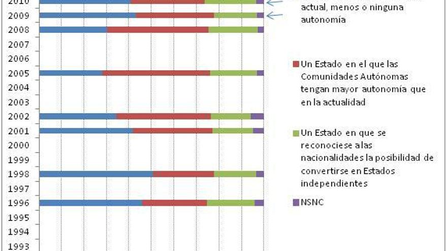 Desde que existen datos disponibles en el CIS, el ciudadano mediano en Cataluña siempre ha querido mayor autonomía que la que le ofrecía el sistema institucional. Si las encuestas son correctas, esta es la opción que siempre habría ganado a cualquier otra, incluyendo, claro está, a la independencia, si los catalanes hubieran podido decidirlo por mayoría. Y lo sigue siendo. (La única excepción parece situarse en 1998, donde una apurada mayoría habría preferido el statu quo a un movimiento hacia el mayor autogobierno. Desgraciadamente, la serie temporal de datos está demasiado fragmentada para poder indagar mucho más sobre esta evolución.)