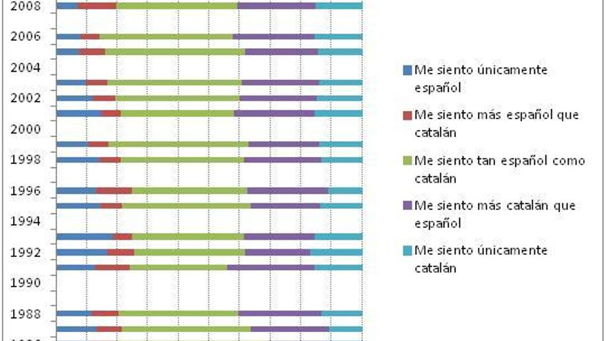 Hasta 2010 la identidad predominantemente o exclusivamente catalana era la respuesta adoptada por un máximo del 40% de los catalanes, normalmente algunos menos. El ciudadano mediano siempre había dicho sentirse tan catalán como español. Hasta poco antes, la identidad más bien española o solo española oscilaba en torno al 20% de la población. En general, las fluctuaciones en los sentimientos de identidad consistían en pequeñas variaciones en la polarización: cuando crecía la identidad catalana también lo hacía la española; cuando la una se manifestaba menos, igual hacía la otra.