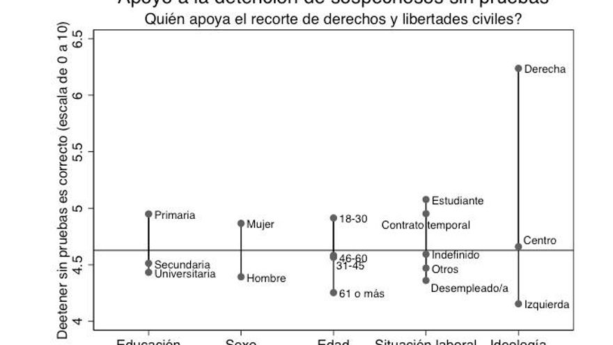 Un hecho particularmente preocupante es que las personas jóvenes y los estudiantes apoyan las detenciones sin pruebas más que otros grupos. En un primer momento esto resulta sorprendente, pero quizás las generaciones mayores sean más garantistas porque tuvieron experiencia directa de la dictadura franquista.