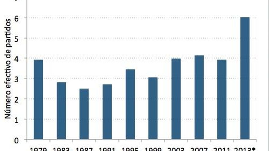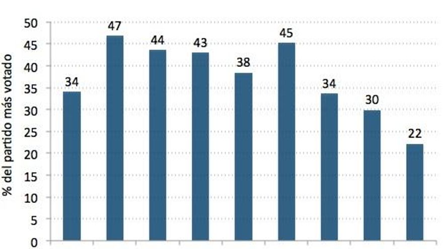 Como muestro en el gráfico 2, el porcentaje de voto del partido más votado se ha reducido considerablemente. Si bien el partido ganador obtenía valores superiores al 40% de los votos durante las primeras décadas de democracia, en las de 2011 este porcentaje ya era de la mitad. Y todo indica que la creciente fragmentación provocará que este porcentaje pueda situarse por debajo del 20% en las elecciones locales de 2015.