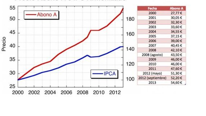Fig. 1. Evolución del precio del abono mensual básico (Zona A) en Madrid frente al aumento del Índice de Precios al Consumo (IPC)
