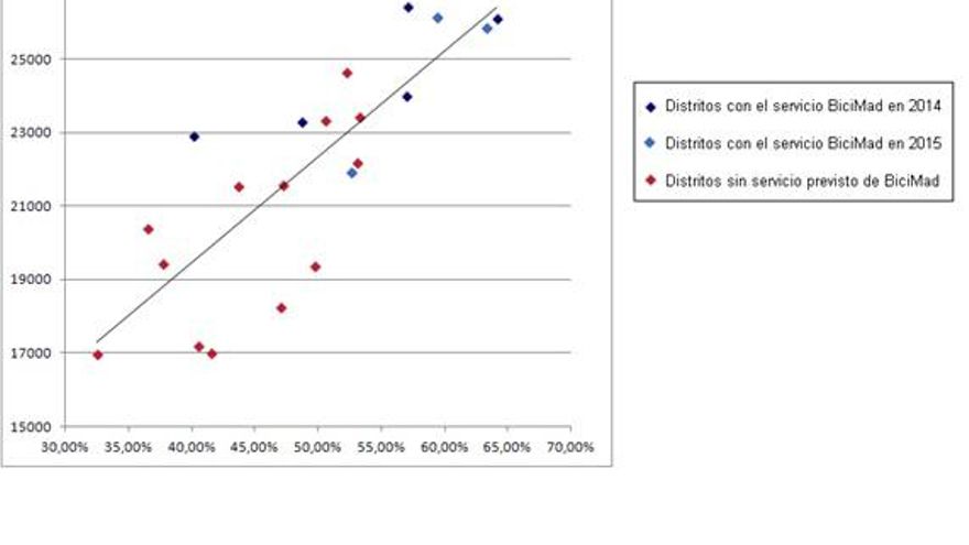 La principal injusticia no radica únicamente en que el servicio se preste principalmente en los distritos afines al partido del gobierno, sino que además estos distritos suelen ser los de mayor renta per cápita. En la figura 3 se puede ver la relación entre renta, voto y establecimiento del servicio. Además, estos distritos son los que cuentan con más vehículos turismos de alta gama (>16 caballos fiscales) y por tanto más contaminantes. Frente al distrito de Latina (3,55%), donde tampoco van a llegar las BiciMad, en Chamartín hay casi el triple de vehículos de alta gama (10,56%). Tal vez, haya alguno que deje su Mercedes o su Audi para coger la bici pública para desplazamientos cortos. Si es así le felicito, aunque también me temo que serán pocos.