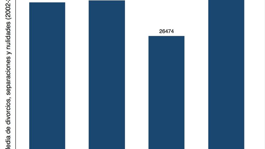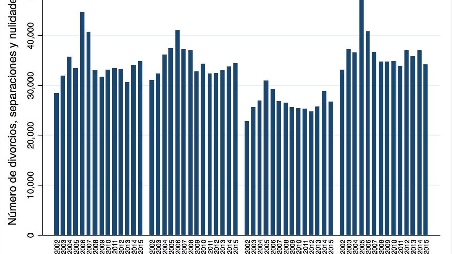 Volvamos a los datos para verlo con más claridad. El gráfico 2 muestra la media de divorcios, separaciones y nulidades entre 2002 y 2015 por trimestre. Efectivamente se distingue que la media de rupturas es más alta en el cuarto trimestre del año (37.000) si la comparamos con la media del trimestre anterior (cerca de 26.500), pero solo ligeramente superior a la cantidad media de parejas que rompen su relación matrimonial durante el primer y segundo trimestre (entre 34.000 y 34.500).