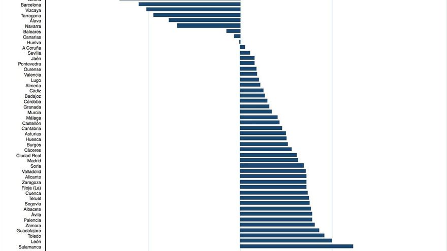 Aprovechando el alto número de observaciones en las encuestas preelectorales del CIS, he utilizado las encuestas de 2015 y 2016 para calcular la posición media en cada una de las provincias españolas en relación a las preferencias sobre el modelo territorial de sus habitantes. Para simplificar su interpretación he recodificado la escala, siendo 1 opciones más centralizadoras (Gobierno central sin autonomías o con CCAA pero con menor nivel de autonomía que en la actualidad) y -1 opciones favorables a un mayor nivel de descentralización (CCAA con mayor autonomía que en la actualidad o incluso con capacidad de convertirse en estados independientes). El 0 refleja las preferencias por el statu quo. El gráfico 3 ilustra la variación a nivel provincial de esta mediada. No hay sorpresas. Las preferencias de los ciudadanos en las provincias catalanas, vascas y Navarra son más proclives a descentralizar el modelo territorial. Las Castillas van en el sentido contrario. Junto a muchos más.