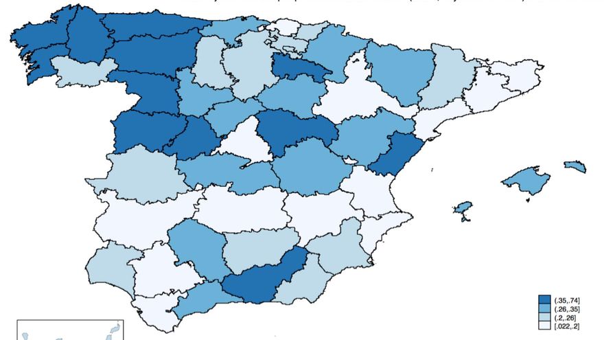 ¿Existe alguna relación empírica entre la variación territorial de esta medida de falta de competitividad a principios del siglo XX con las preferencias territoriales actuales? Veámoslo.