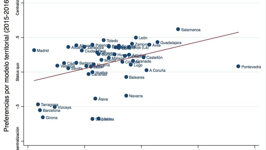 Seguramente pueda argumentarse que aquí hay correlación pero no causalidad. Que seguramente exista, al menos, una variable omitida que explique el porqué de algunos territorios con más o menos resistencia a la supresión de la comeptición electoral, y que sea ésta en realidad la que nos explique las preferencias actuales sobre la organización territorial. También podría argumentarse que de la misma forma que encontramos una asociación con las actuales preferencias territoriales podríamos encontrala con otras variables que reflejen valores conservadores o, incluso, el voto a partidos de derechas. Y que, por tanto, el acento puesto en la cuestión territorial no se justifica.