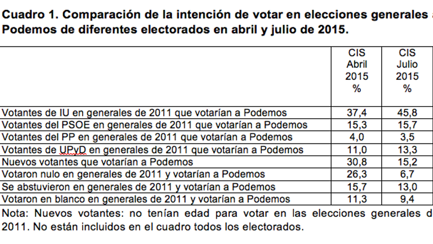 Hace unos días, el CIS dio a conocer los resultados del barómetro de julio que incluye, como cada tres meses, indicadores de voto sobre las elecciones generales. La instantánea del pulso electoral ha vuelto a confirmar un tablero ocupado principalmente por cuatro partidos: con un PP en la primera posición (28,2% del voto estimado), seguido del PSOE (24,9%), Podemos (15,7%) y Ciudadanos (11,1%). Pero, como se puede comprobar en el gráfico 1, se han producido variaciones respecto al registro demoscópico anterior, pues de acuerdo con la estimaciones del CIS, entre abril y julio, el PP ha experimentado un incremento de sus apoyos potenciales (+2,6 puntos porcentuales) al igual que el PSOE (+0,6), frente a un retroceso de Podemos (-0,8) y de Ciudadanos (-2,7). Una evolución que para algunos sería suficientemente indicativa de que nos encontramos ante un punto de inflexión con el incuestionable resurgimiento del bipartidismo y el imparable declive de las fuerzas emergentes. A lo que, según esta interpretación, habría que añadir que dado que la cuantía del crecimiento del PP y del PSOE es similar al retroceso de las fuerzas emergentes, los populares habrían recuperado a parte de sus votantes fugados a Ciudadanos y los socialistas a sus electores huidos a Podemos.