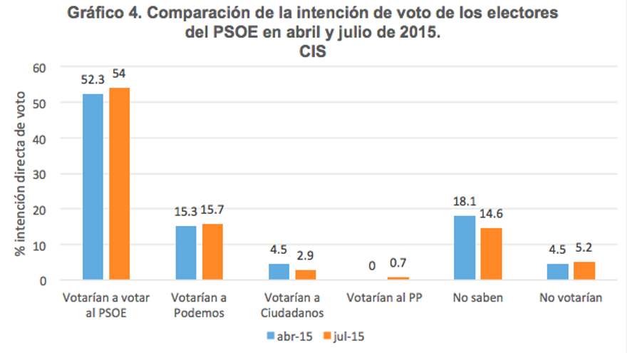 Nota: Votantes del PSOE: aquéllos que declaran haber votado al PSOE en las elecciones generales de 2011. No están incluidas en el gráfico todas las respuestas que dan estos electores a la pregunta “suponiendo que mañana se celebrasen elecciones generales, es decir, al Parlamento español, ¿a qué partido votaría Usted?”