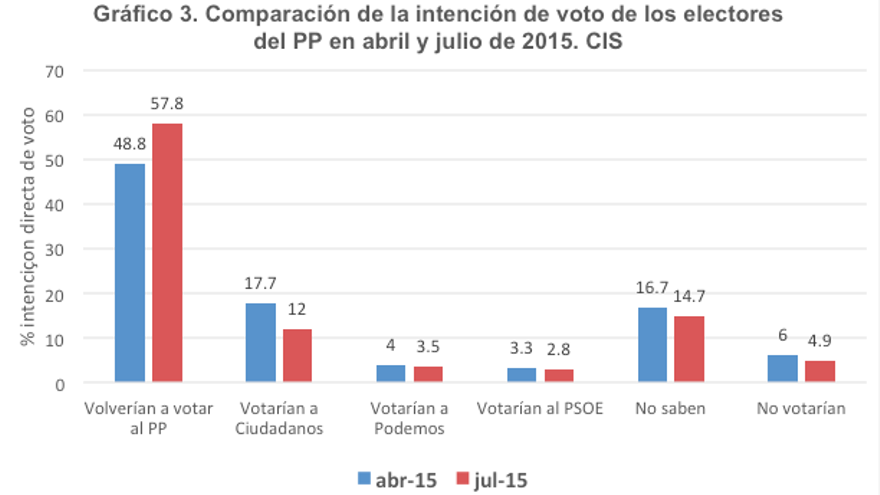 Nota: Votantes del PP: aquéllos que declaran haber votado al PP en las elecciones generales de 2011. No están incluidas en el gráfico todas las respuestas que dan estos electores a la pregunta “suponiendo que mañana se celebrasen elecciones generales, es decir, al Parlamento español, ¿a qué partido votaría Usted?”