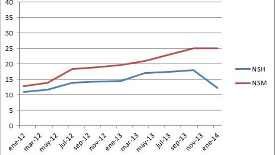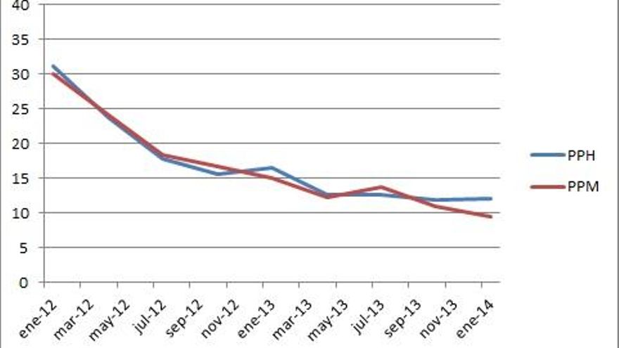 ¿Qué ha cambiado durante esta legislatura? Lo primero es que, dentro de la tendencia al descenso en la popularidad del partido del gobierno, los hombres y las mujeres se han alineado casi perfectamente en su intención de votar al PP, o de no hacerlo. La brecha de género casi se puede decir que ha desaparecido, para los populares, en el descalabro, con perdón del chiste fácil. Lo segundo es que, contra algunas apariencias, durante el primer año post-Zapatero el PSOE había mejorado su posición relativa entre las mujeres: hasta enero de 2013 el apoyo femenino superaba en casi 3 puntos al masculino, uno más que en la anterior legislatura. Dicho de forma menos complaciente, las mujeres lo habían abandonado menos que los hombres. En el último año, sin embargo, el PSOE ha perdido toda su ventaja en intención directa de voto de las mujeres. Ahora resulta tan atractivo, o tan poco, para unas como para otros. Como el PP.