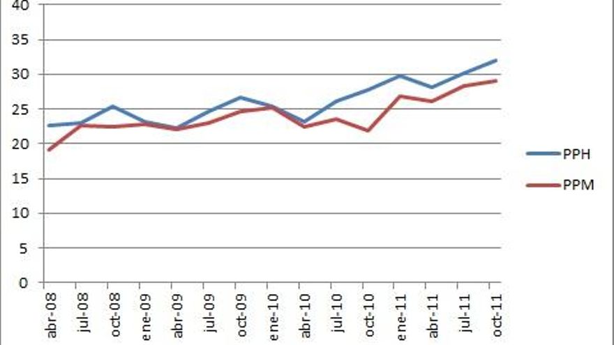 Para poner las cosas en perspectiva, conviene hacer un poco de memoria y recordar que, durante la pasada legislatura, el PP solía estar en desventaja entre las mujeres en comparación con los hombres, mientras que al PSOE le sucedía lo contrario. Tomemos como indicador de apoyo la intención de votar a un partido (pregunta directa, sin más): el porcentaje de personas con intención de votar al PP fue, en promedio durante la legislatura, 2 puntos porcentuales más alto entre los hombres que entre las mujeres, mientras que el porcentaje de mujeres con intención de votar al PSOE fue 1,9 puntos mayor que en el caso de los hombres. No son diferencias abrumadoras en popularidad, pero sí potencialmente importantes. Además, hay (ligeramente) más mujeres que hombres en el electorado. Lo bastante importantes como para que el PP lanzara su primera campaña explícita para la captación de voto femenino en el segundo cuarto de 2011,tras un año en el que la brecha de voto popular entre mujeres y hombres se había agrandando.