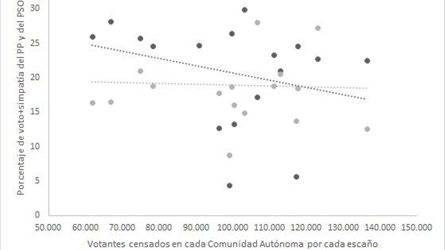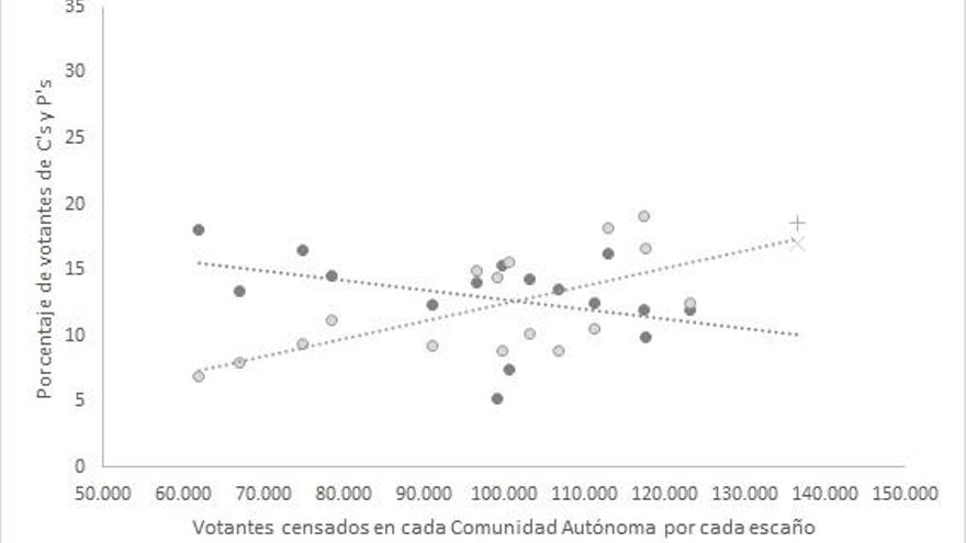 Es el momento de notar que también es un sesgo centralista. El 39,5% de los votantes potenciales de Ciudadanos el 20D son centralistas (según la anterior definición: desean limitar o suprimir el estado autonómico) frente al 22,4% de Podemos. El PP sigue siendo, por cierto, el partido preferido por los centralistas, el 45,7% de sus votantes potenciales, según el CIS, lo son; y el PSOE, el menos: el 20,9%. Ambos partidos centralistas, medido esto de forma aproximada por su distribución en las Comunidades Autónomas, se benefician, a su vez, de la sobrerrepresentación del interior, donde este clima de opinión es más fuerte.