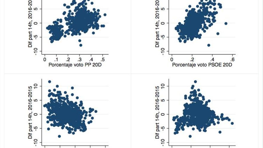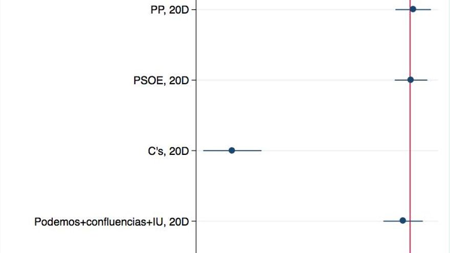 El gráfico 2 resumen estos hallazgos. Si la línea horizontal que acompaña al punto se solapa con el cero, la conclusión es que, después de tener en cuenta los efectos de cada provincia, no hay una relación estadísticamente significativa entre el apoyo a un partido y el cambio en la participación observada. Es el caso del voto al PP, del PSOE, y de Unidos Podemos. Sí hay una relación significativa entre el voto a Ciudadanos y la caída de la participación. Como todos los datos agregados, hay que tomarlos con mucha precaución: pero estos datos parecen apuntar a que Ciudadanos está teniendo problemas para movilizar a sus votantes el 20D.