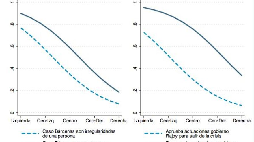 En el gráfico, mostramos el efecto que está teniendo el caso Bárcenas sobre la probabilidad de dejar de votar al PP. Fíjense en el gráfico de la izquierda. La línea continua muestra la probabilidad de abandonar al PP entre aquéllos que consideran que existe una trama dentro del partido y la línea discontinua la probabilidad entre los que sólo responsabilizan a Bárcenas o no saben.Calculamos cómo cambia esa probabilidad en función de la ideología de los exvotantes del PP (la gran mayoría de ellos son de centro-derecha y centro).