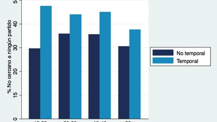 Es importante mencionar que la mayor alienación política de los trabajadores temporales no es el resultado de que este grupo esté compuesto desproporcionalmente por trabajadores jóvenes, que tradicionalmente expresan una desafección mayor hacia el sistema político. Incluso después de descontar el efecto de la edad, los estudios y el interés por la política, los trabajadores temporales siguen siendo más críticos con la oferta electoral existente. El gráfico 3 muestra la proporción de encuestados que es incapaz de dar el nombre de un partido a la pregunta “¿Por qué partido siente más simpatía o considera más cercano a sus propias ideas?”. Aunque en todos los grupos de edad los trabajadores con contrato temporal son mucho más proclives a no sentirse cercanos a ningún partido, es llamativo la diferencia de casi veinte puntos entre el grupo de trabajadores más jóvenes.