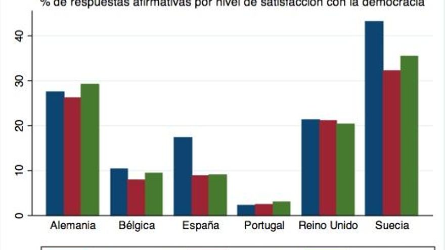 No obstante, según los datos de la encuesta social europea, España sí tiene otra particularidad en el perfil de los que abrazan el boicot como instrumento político. Como se ve en el último gráfico, el consumo político es mayor entre aquellos ciudadanos que declaran cierto grado de insatisfacción con la democracia. De hecho, son cerca del doble de los que se encuentran a gusto con el funcionamiento de la misma en España. Dicha diferencia no se percibe en ninguno de los otros países de este análisis, sólo con menor intensidad en Suecia, donde los niveles de participación política no convencional son en general altos.