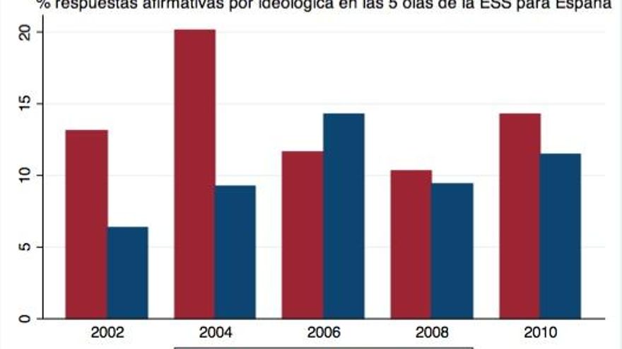 Intrigado por este resultado, he producido otro gráfico con las diferencias ideológicas entre los consumistas políticos de nuestro país para todas las olas de la Encuestas Social Europea. El gráfico 6 muestra que en España ha existido cierta correlación entre el nivel de activismo político en relación al consumo y el color o la circunstancia política del gobierno de turno. El porcentaje personas de izquierdas que ha declarado haber participado en algún boicot lo han hecho en la última legislatura de José María Aznar. En cambio aquellos ciudadanos que se declaran de derechas manifestaron en una mayor proporción haber realizado algún tipo de consumo político en la primera legislatura de Zapatero, posiblemente como consecuencia de las campañas contra productos catalanes a raíz del papel de ERC como apoyo parlamentario del gobierno socialista.
