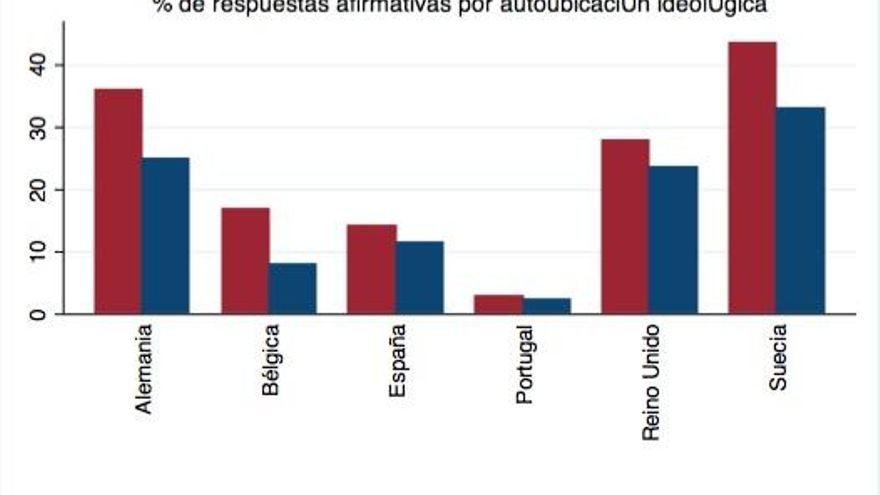 Un aspecto singular de España en relación al resto de países es el perfil ideológico de los ciudadanos que declaran haber realizado algún acto de consumo político durante los últimos años. En la mayoría de los casos, el porcentaje de encuestados que se declaran de izquierdas[2] es considerablemente mayor que el porcentaje de ciudadanos de derecha. No obstante, en nuestro país –entre el 2010 y el 2011 – la proporción de consumistas políticos se repartía de forma similar a ambos lados de la escala ideológica (gráfico 5). Después del caso portugués (con niveles muy bajos de consumo político), España tiene la menor diferencia entre ambos grupos ideológicos; poco menos de 3 puntos porcentuales comparados con cerca de 9, 10 y 11 puntos de diferencia en Bélgica, Suecia y Alemania respectivamente.