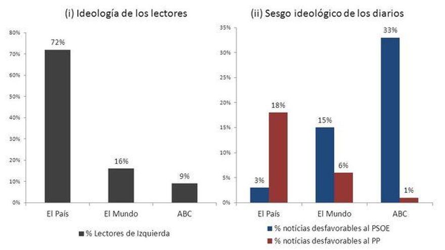 Es conocido que en España (al igual que otros países del sur de Europa) existe una estrecha complicidad entre los medios de comunicación y los intereses partidistas. Esto provoca que los quioscos de nuestro país contengan una oferta mediática con un elevado sectarismo político. Según un estudio de Antón Castromil, los periódicos claramente se alinearon a un partido político a la hora de informar de la campaña electoral de las elecciones autonómicas y municipales de 2011 (véase el gráfico). Por ejemplo, El País prácticamente no recogió informaciones perjudiciales para el PSOE y, en cambio, dedicó casi una quinta parte de sus artículos a publicar informaciones críticas con PP. Lo opuesto ocurría en El Mundo y, muy particularmente en el ABC. En este último periódico, nada menos que una de cada tres noticias publicadas contenía mensajes negativos hacia el PSOE, lo que contrastaba con la práctica inexistencia de noticias críticas con el PP (apenas un 1% y no descarten que fueran obra de un becario despistado).