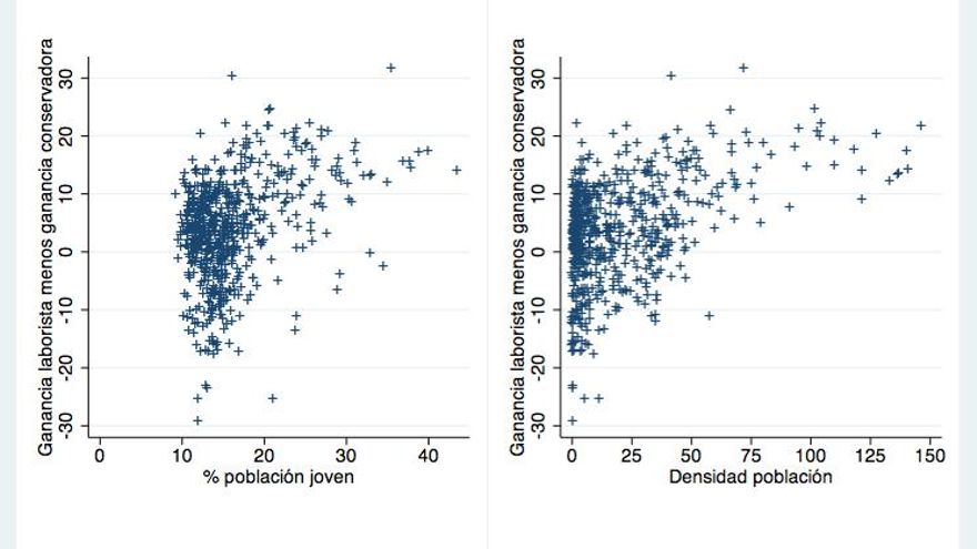 Gráfico 2. “Swing” hacia los laboristas en función de la presencia de jóvenes y de la densidad de población del distrito.