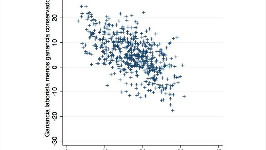 Aún es pronto para extraer conclusiones sobre las causas últimas de la distribución del voto en esta elección, pero el análisis preliminar de los patrones de cambio de voto por distritos puede darnos algunas pistas. Los siguientes gráficos reflejan en el eje vertical el incremento del porcentaje de voto laborista menos el incremento del porcentaje de voto conservador (lo que los británicos llaman el “swing” respecto de la elección anterior), que tomamos como una medida de si el distrito se hace “más laborista” (si el índice toma un valor positivo alto) o “más conservador” (si el índice toma un valor negativo alto).