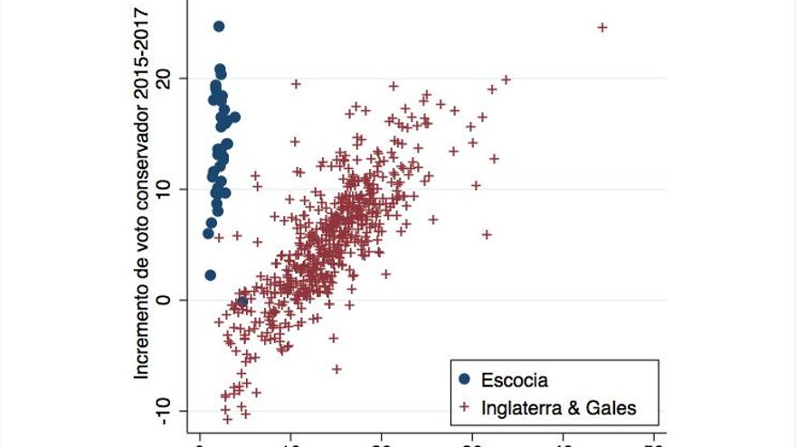 Una de las noticias de estas elecciones es descalabro de los nacionalistas escoceses, que caen en todas las circunscripciones, y en un tres cuartos de ellas, por más de 10 puntos. Sin embargo, electoralmente Escocia sigue siendo otro mundo. Aunque los escoceses han votado mucho más a partidos británicos que en 2015, las fuerzas que explican este voto parecen ser muy diferentes a sus determinantes en el resto de la unión. Un ejemplo lo vemos en el gráfico 4, que refleja la relación entre el crecimiento del voto de los conservadores y el porcentaje de voto que obtuvo UKIP en 2015. Mientras que en Inglaterra y Gales el hecho de que existiera un electorado de UKIP hace dos años explica buena parte del crecimiento de los conservadores en 2017, en Escocia (donde UKIP apenas tenía presencia) los tories logran crecer por causas diferentes.