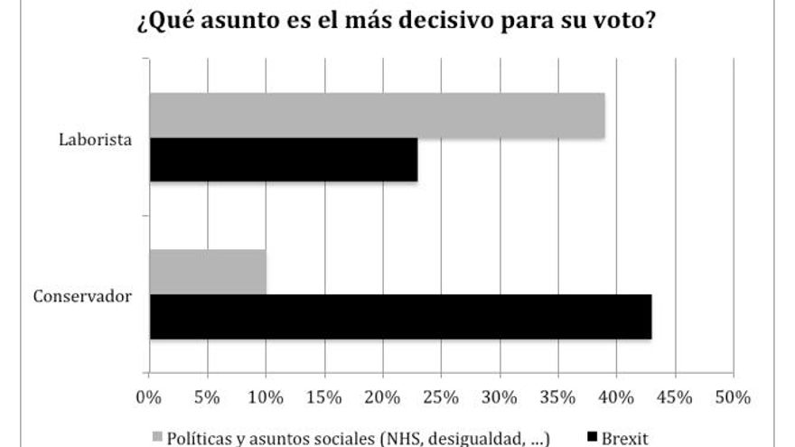 Estas dos narrativas se han reflejado simétricamente en el electorado. El siguiente gráfico muestra el porcentaje de votantes que a la pregunta “¿Qué asunto es el principal para decidir su voto?” contestan el Brexit o cualquiera de una series de asuntos o políticas sociales. Los encuestados están divididos entre los que votaron a los conservadores en 2015 y los que votaron laborista.