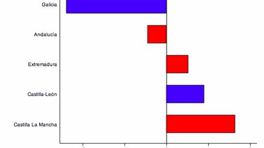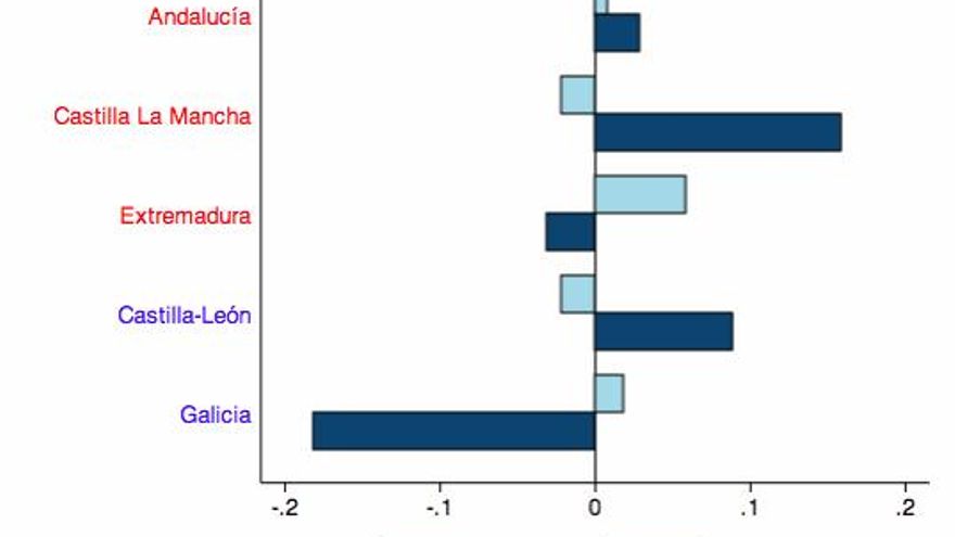En el caso de Andalucía, tanto los más pobres y los más ricos han mejorado su nivel de gasto a costa de la clase media. Aunque los segundos lo han hecho un poco más que los primeros. En Castilla la Mancha el decil más pobre ha empeorado su situación en comparación con la media, pero los ricos la han mejorado. Extremadura es la única región socialista que se acerca a una lógica socialdemócrata. Lo más pobres mejoran su posición y los ricos la empeoran en relación a la clase media. En los feudos populares el decil inferior de la distribución desciende su nivel de gasto en Catilla León y aumenta en Galicia, sucediendo lo contrario para el decil superior (p90). De hecho, en Galicia gran parte de la reducción de las desigualdades se explica por una pérdida de posiciones de los más ricos.