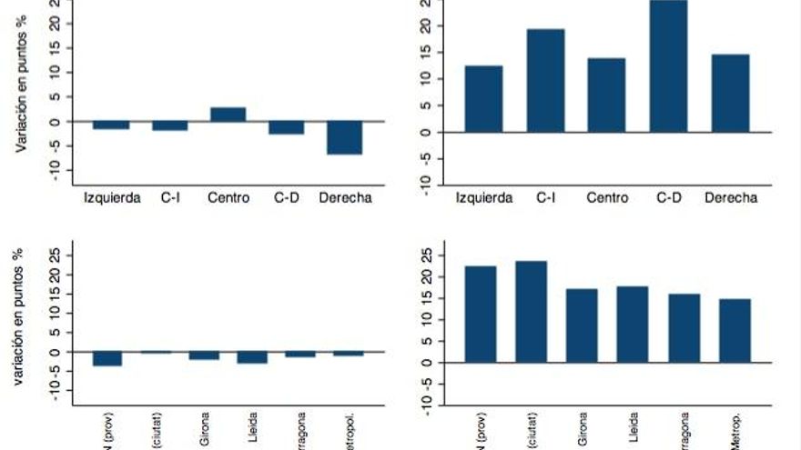 En concreto, desde la decisión de CiU de apostar abiertamente por la independencia, se ha producido una polarización en el comportamiento electoral de los catalanes. Los partidos más extremos en el eje nacionalista (C’s , CUP y ERC) han ganado terreno a los partidos que hasta entonces habían ocupado una posición central en la política catalana. La polarización en la dimensión nacional se ha visto claramente reflejada en que actualmente el mercado electoral catalán se ha divido en dos según la afiliación nacional de los votantes. En Cataluña ya no existen partidos verdaderamente transversales; la fuerza electoral de CiU se ha replegado entre el catalanismo y la del PSC hacia el españolismo.