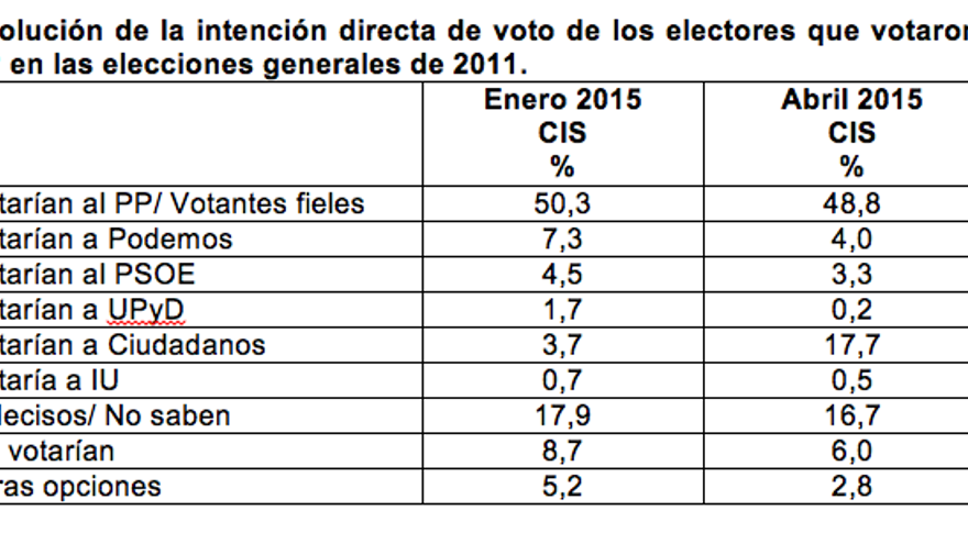 Para los populares, Ciudadanos es a la vez un competidor electoral y una potencial tabla de salvación para mantenerse en el poder. Electoralmente Ciudadanos es incómodo para el PP porque le dificulta recuperar a sus votantes desencantados. Los datos del CIS vienen a corroborar la capacidad de atracción que ejerce el partido de Rivera en este electorado. No se trata de que los populares pierdan en masa a sus votantes fieles, sino que los que se habían ido ya a otras opciones o se refugiaban en la indecisión eligen ahora a Ciudadanos. Entre enero y abril el porcentaje de electores que optaron por el PP en las elecciones generales de 2011 y que darían su apoyo a Ciudadanos ha pasado del 3,7 a casi el 18%. De hecho Ciudadanos se alimenta de votantes de UPyD y de electores descontentos del PP, seguido de votantes “huérfanos” (que optaron por el voto nulo en 2011 y el voto en blanco).