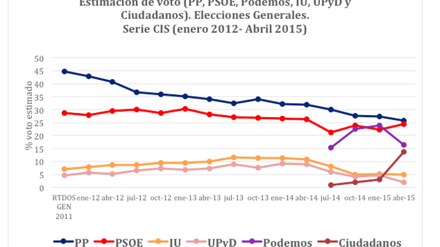 La entrada en el juego de Ciudadanos ha supuesto importantes efectos para el resto de partidos y cambios en el trasvase de votos del electorado descontento. De acuerdo con las estimación del CIS, si se celebraran ahora elecciones generales, el PP sería hoy el partido más votado (con el 25,6% de los votos), seguido muy de cerca del PSOE (24,3%), Podemos (16,5%) y Ciudadanos (13,8%). En los últimos tres meses, Podemos ha visto menguar sus apoyos de forma considerable (con una caída de 7,4 puntos porcentuales en voto estimado), pasando de la segunda posición que le había arrebatado al PSOE a ser la tercera. Los socialistas han mejorado ligeramente sus expectativas y se han puesto por delante de Podemos conjurando así el fantasma del “sorpasso”, mientras los populares han retrocedido de forma ligera y Ciudadanos ha crecido exponencialmente (para desesperación de UPyD).