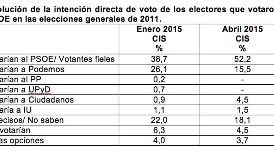 Desde el planteamiento de que “los adversarios de tus adversarios son tus amigos” el PSOE ha encontrado en Ciudadanos un inesperado “aliado”. Una posible lectura es que con Ciudadanos la competición política se ha vuelto más ideológica y mucho menos polarizada de lo que le convenía a Podemos y al PP. Podemos ha dejado de ser el fenómeno de moda y el único refugio para los descontentos que no confían en los partidos tradicionales. Ciudadanos ha contribuido a empañar la imagen de Podemos (al ponerse más el foco de atención en las contradicciones de esta formación y al perder la condición de ser el último en llegar cuando ser el “nuevo” suma y no resta). Como se puede comprobar en la tabla, en los últimos meses los socialistas han recuperado a parte de sus votantes desencantados que se habían ido a Podemos, mientras que las fugas de sus electores hacia Ciudadanos es relativamente pequeña (y, en cualquier caso, compensada con creces con los votantes desencantados que recupera y que queda reflejada en un significativo incremento del porcentaje de votantes fieles).