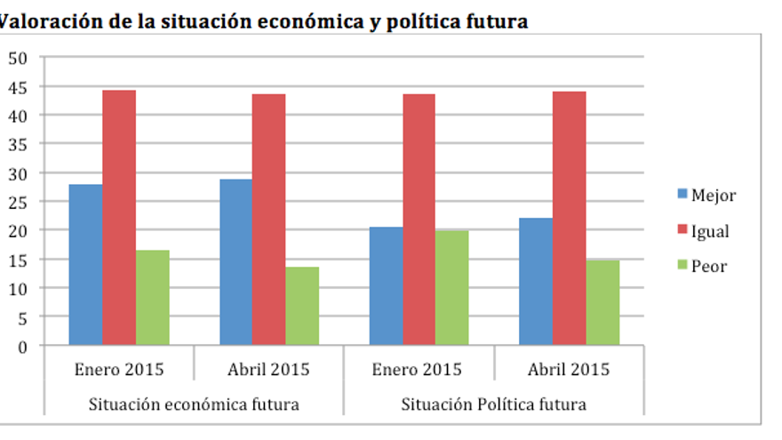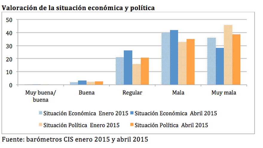 La valoración ciudadana de la situación económica ha ido mejorando de manera más o menos continuada desde el 2013. No ha ocurrido lo mismo con la valoración de la situación política, que batió récords en la serie histórica del CIS a finales de 2014 (con porcentajes entre el 50 y el 60% de quienes valoraban la situación política como “Muy mala”). Sin embargo, desde enero se viene produciendo la mejora más continuada y significativa de la valoración de la situación política desde 2013. Puede deberse a múltiples factores. Uno de ellos: que finalmente la mejora de las perspectivas económicas estén penetrando en el ámbito de la política. Pero si esto fuera así, ¿por qué la evolución de la economía y la política no ha sido paralela hasta hace tres meses? Otra posible explicación: quizás tenga que ver con la transformación del panorama político. La mejora de la valoración de la situación política comienza justo en el momento en el que se confirma que el sistema de partidos no va a ser lo que era. Y ello quizás puede ayudar a reducir el pesimismo ciudadano, al darles la esperanza de que comienza un tiempo nuevo en política para todos los partidos.