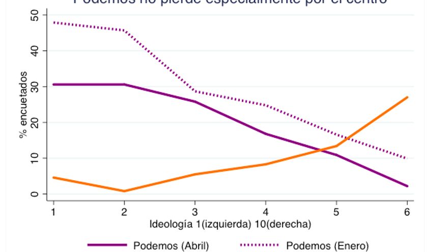 La narrativa de la semana pasada era la siguiente: en los últimos meses Podemos estaría retrocediendo en su intención de voto debido a que Ciudadanos estaba robándole parte de los exvotantes socialistas más moderados. Desde esta perspectiva, C’s estaría atacando las fronteras electorales que Podemos tenía en el centro y estaría obligando al partido de Pablo Iglesias a replegarse hacia posiciones ideológicamente más extremas. Así lo contábamos en este post la semana pasada usando la encuesta de GESOP. Pues bien, la llegada del barómetro de abril del CIS pone en entredicho esta interpretación. Según esta nueva encuesta, la caída de Podemos en intención de voto poco tendría que ver con la ideología de los votantes. Si acaso, serían los votantes más de izquierdas los que estarían abandonando en mayor proporción al partido de Pablo Iglesias.
