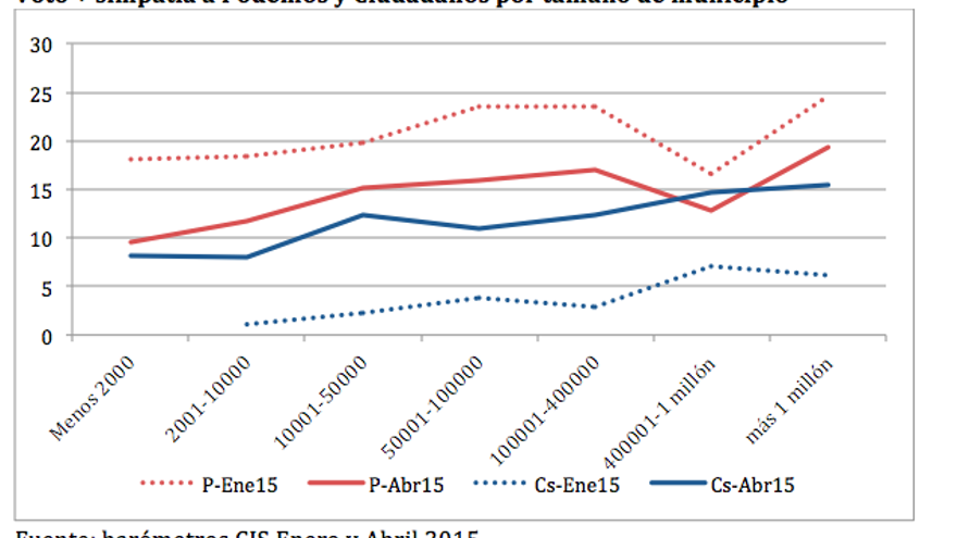Una cuestión fundamental de la que dependerá el éxito electoral de Podemos y Ciudadanos en las próximas generales es su capacidad de competir por el voto en los distritos donde se eligen menos representantes (que coinciden con los núcleos de población menos habitados). Los datos del último barómetro muestran que Podemos ha perdido algo de penetración territorial porque sus apoyos han disminuido algo más en municipios pequeños y medianos que en los grandes (más de cien mil habitantes). La tendencia no es dramática, aunque si se intensificara en los próximos meses le restaría capacidad para conseguir representación en el Congreso. En el caso de Ciudadanos, en poco más de tres meses ha conseguido apoyos donde antes prácticamente era invisible (municipios de menos de 2000 habitantes), lo que implica que a día de hoy las diferencias en el grado de penetración de Podemos y Ciudadanos entre municipios grandes y pequeños sean parecidas.