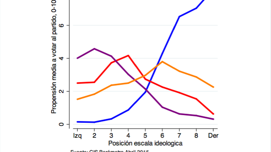 De hecho, como muestra el gráfico y en línea con lo que decíamos más arriba, Ciudadanos resulta más atractivo para los votantes de centro-derecha que para los de centro izquierda o incluso que para los de centro (recordemos que atrae a más de cuatro votantes populares por cada votante procedente del PSOE).