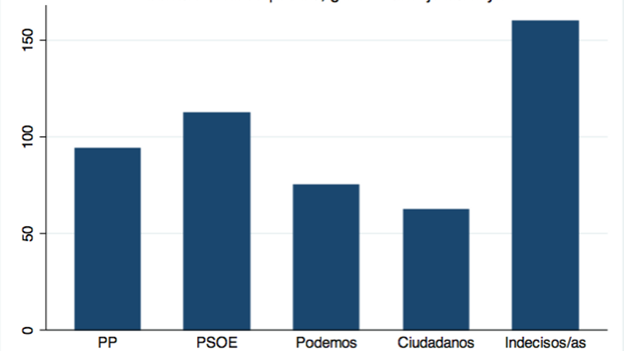 Algo que no es novedoso de esta encuesta, pero que merece la pena ser resaltado es el fuerte sesgo de género de los electorados de los nuevos partidos, y en especial el de Ciudadanos. El partido de Albert Rivera tiene el electorado más masculinizado de todos: por cada 100 encuestados hombres que declaran al CIS que votarán a Ciudadanos, sólo hay 62 mujeres. ¿Cómo es posible esto, si PP y PSOE tienen hombres y mujeres en proporciones relativamente similares? La explicación está en el gráfico: las mujeres tienen hoy mucho menos decidido su voto que los hombres. ¿Será a ellas a las que los partidos tendrán que convencer en la campaña? ¿A quién acabarán votando?
