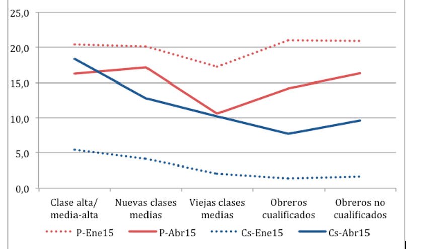 El retroceso en los apoyos de Podemos detectado en este barómetro va acompañado de una disminución de la homogeneidad en sus apoyos según clase social. Podemos pierde porcentaje de voto entre los grupos de viejas clases medias y entre los obreros cualificados. Sin embargo, el partido de Pablo Iglesias sigue mostrando apoyos similares entre los extremos de la distribución (clases altas y obreros cualificados) por lo que se observa cierta polarización en el voto a Podemos según la clase social. A pesar de estos cambios, Podemos sigue siendo un partido más transversal que Ciudadanos. El despegue de este último partido es desigual entre clases: el porcentaje de voto + simpatía aumenta en todos los grupos, pero mucho más en las clases altas y nuevas clases medias. Ciudadanos crece intensificando las diferencias en voto+simpatía entre grupos sociales.