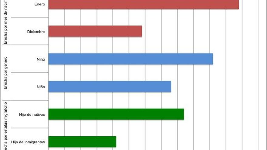 Para ilustrar la magnitud del ‘efecto mes de nacimiento’, el segundo gráfico compara la brecha entre los nacidos en enero y diciembre, la de género y la asociada al estatus migratorio de los padres. Cuantitativamente, la del mes de nacimiento es la más importante de las tres.
